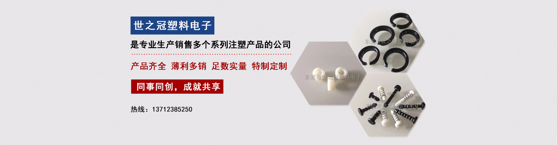 东莞市世之冠塑料电子科技有限公司是一家专业生产销售注塑配件和加工订制异型弹簧。旗下注塑配件有螺柱系列、配线系列、PC隔离柱系列、LED灯座系列、绝缘垫片系列、尼龙塞头系列、防水接头系列、以及保险丝、电源开关和按钮开关等多系列注塑产品。